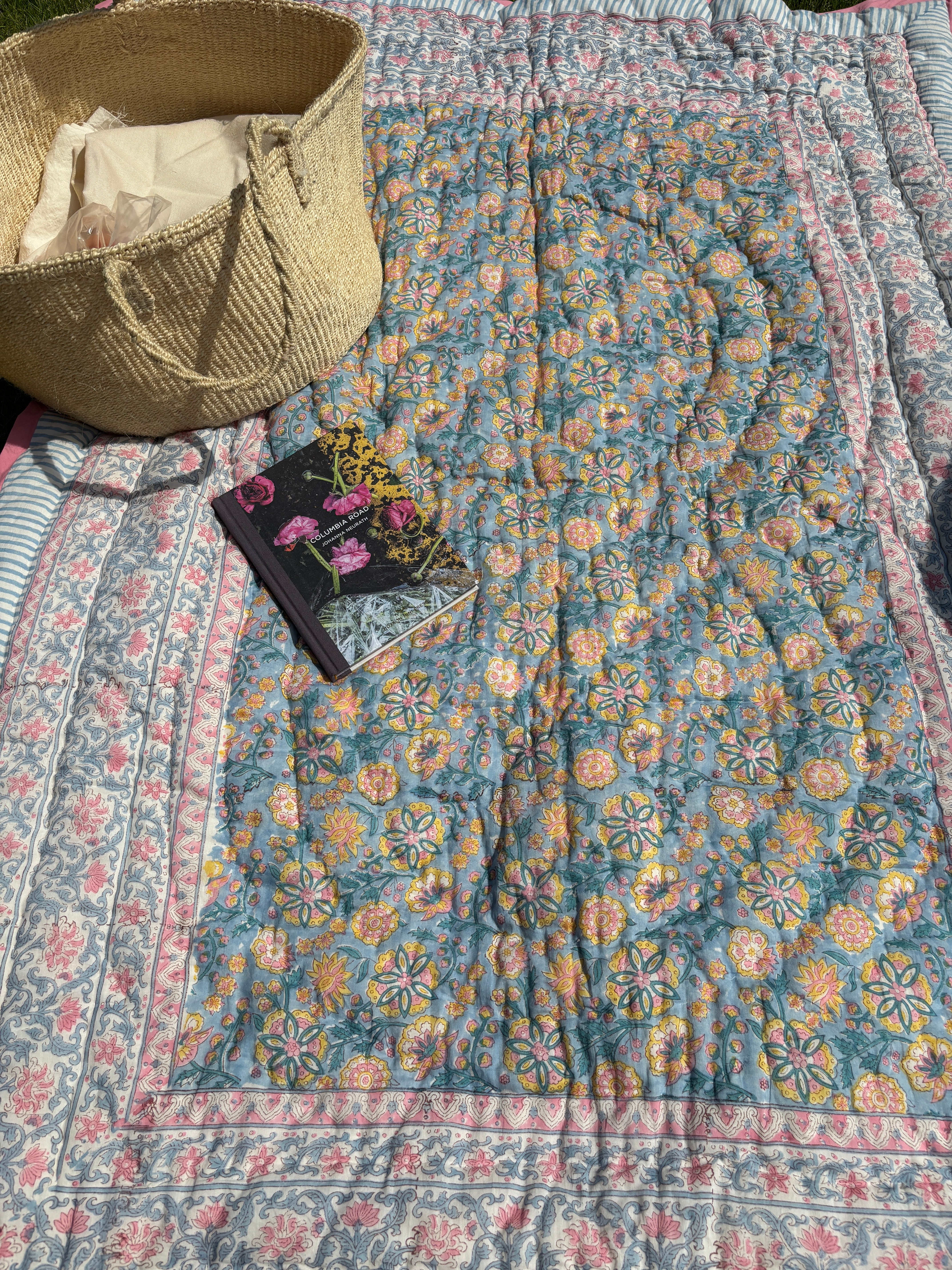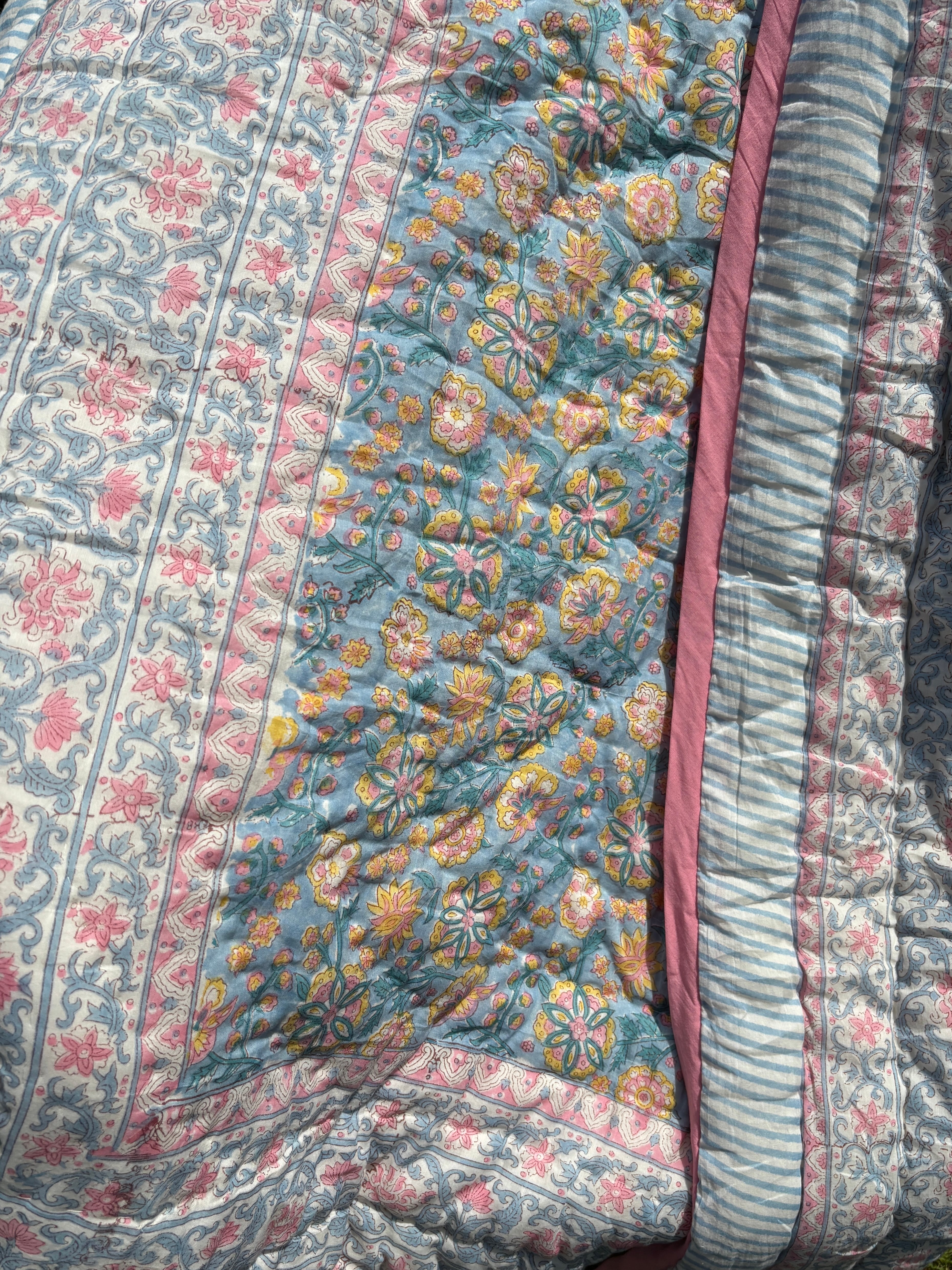 Cotton100%で柄から仕上げまで職人の手作業で仕上げられた軽くて柔らかい中綿入りのリバーシブルキルト ー