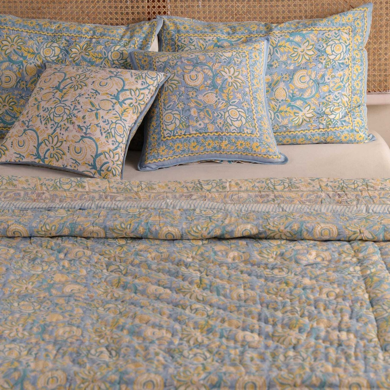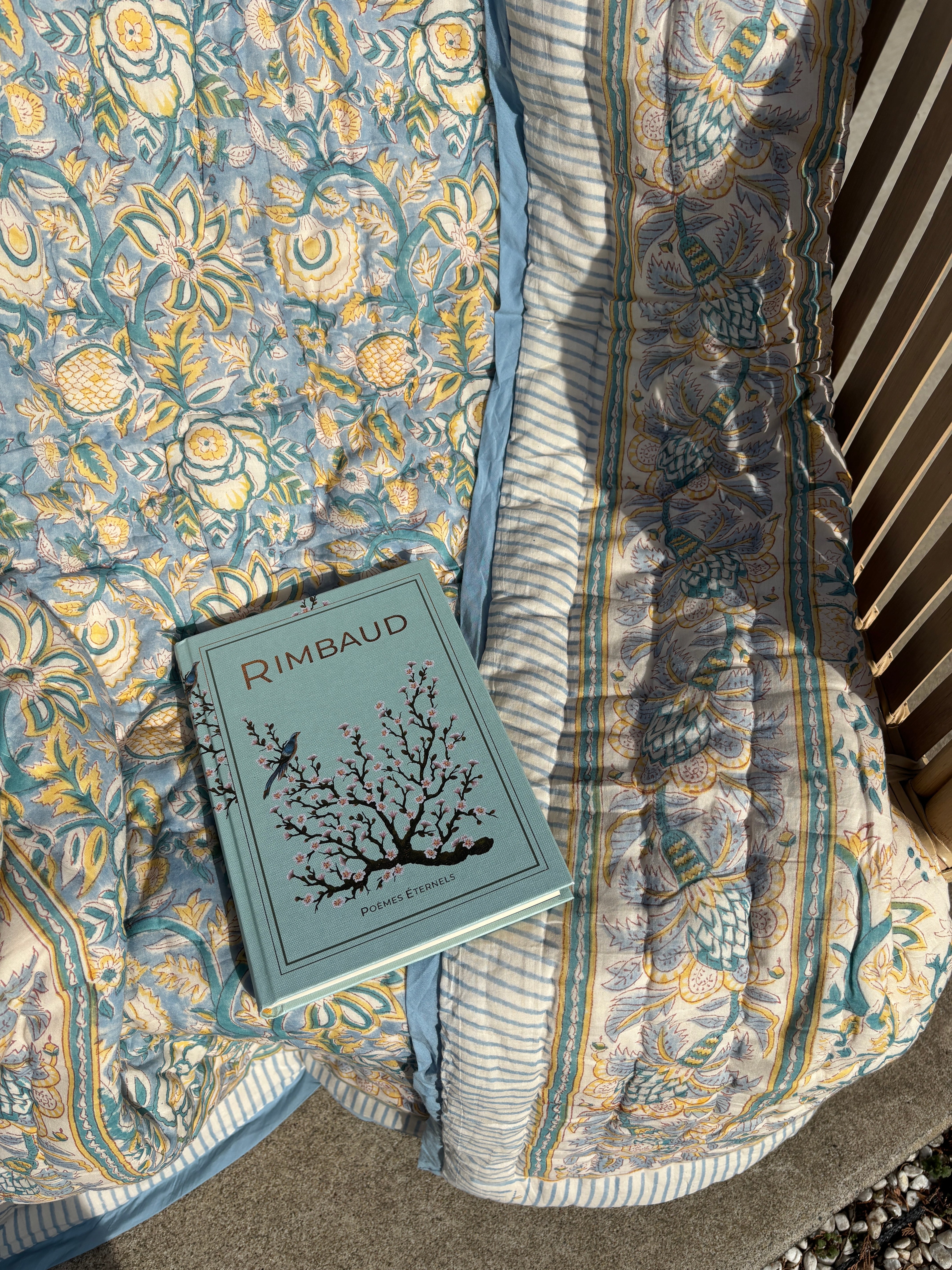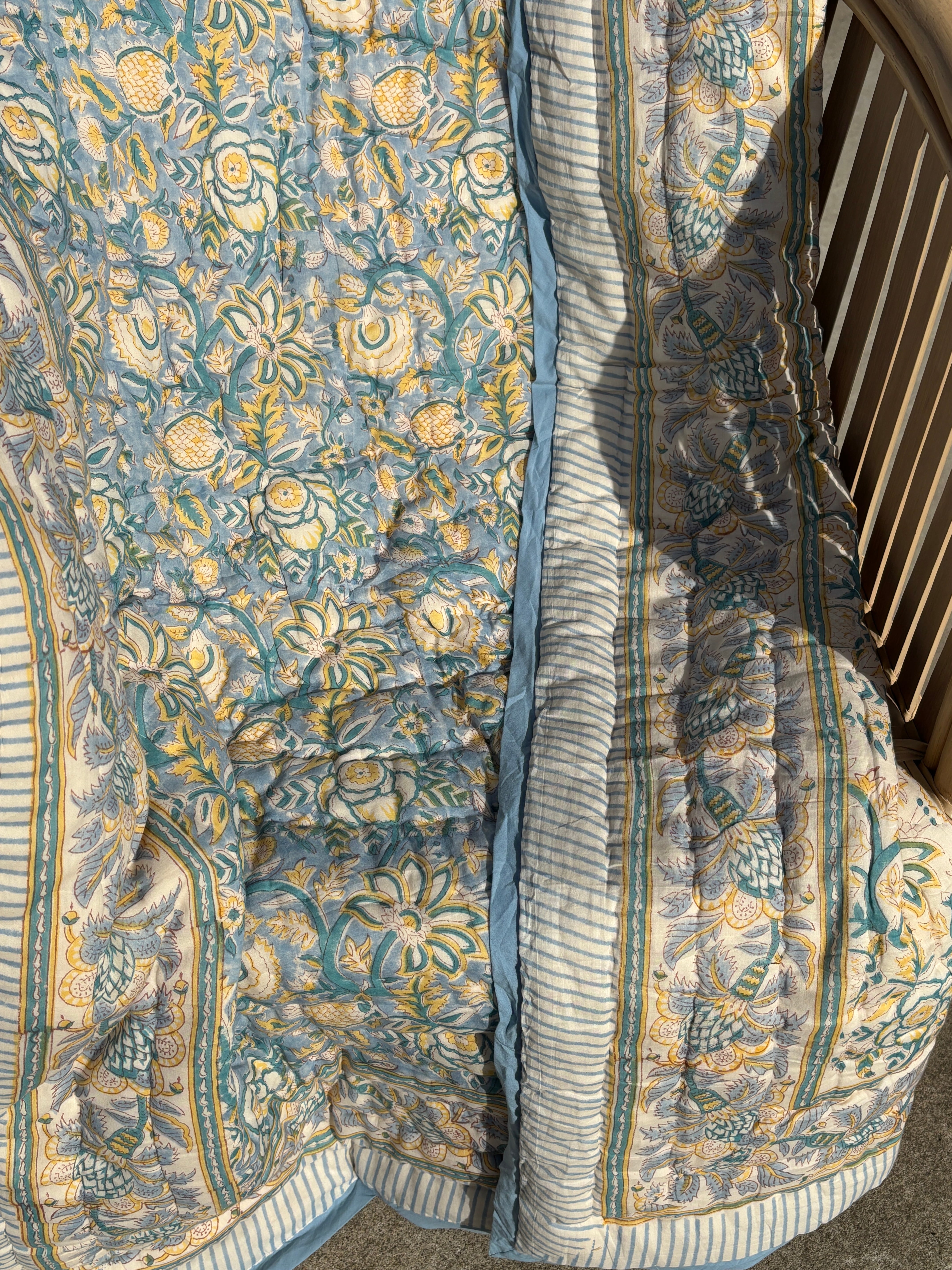 S【Baby size】Block print Reversible quilt / Blue yellow